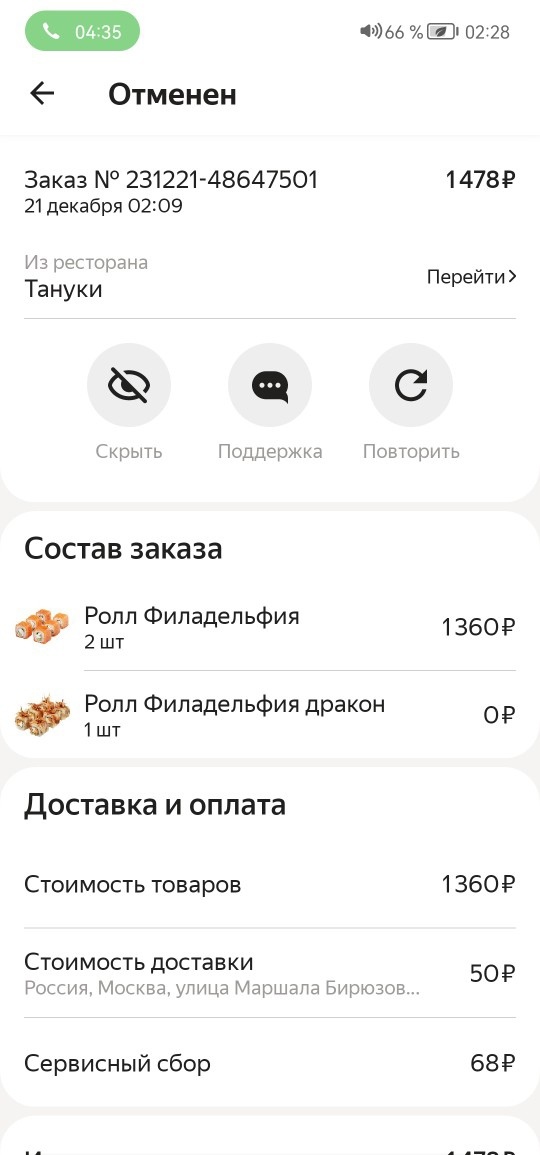 Здравствуйте, пикабучане, недавно со мной произошел интересный случай, доходящий до абсурда, показывающий отношения ЯН. к своим клиентам. Я в "Яндекс еда" 21.12.23 в 2:09 случайно сделал заказ и в эту же минуту пытался его отменить, но ошибка приложения не давала мне этого сделать (табло вылезло при отмене аля " технические ошибки"). Через минуту в 2:10 я сразу написал в поддержку об отмене заказа и параллельно позвонил в ресторан Тануки, где уведомил о случайном заказе( сделал все по человечески и всех уведомил, чтобы никого не запрягать, если вручную не получилось отменить заказ), мне сказали, что заказ отменят и далее по вопросу возврата денег меня перевели на поддержку Яндекса. Там мне сообщили, что никакие деньги не вернут, якобы уже начали готовить заказ (конечно время идет пока дозвонишься, но будем честны за 2 минуты мне никто заказ даже не начнет делать) , и все деньги пойдут на оплату потраченных продуктов. В поддержке мне никто не объяснил на оплату каких продуктов пошли мои деньги, если я отменил заказ в ту же минуту в какую и сделал его. С такой клиентированностью лучше обходите этот сервис, а пока направил заявление в роспотреб, будем ими заниматься