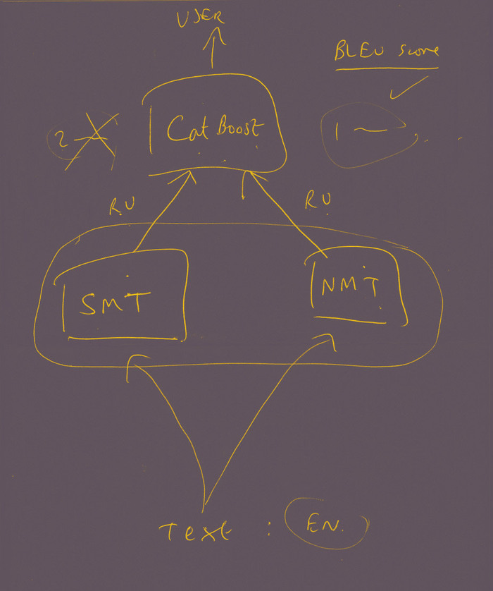 Вот как это работает. Предположим, у нас есть на входе какое-то предложение и мы переводим его с помощью обеих моделей. Если бóльшая часть слов из одного варианта перевода соответствует словам, которые были в обучающей выборке, то классификатор выбирает именно этот вариант и запоминает особенности, сделавшие этот перевод хорошим.