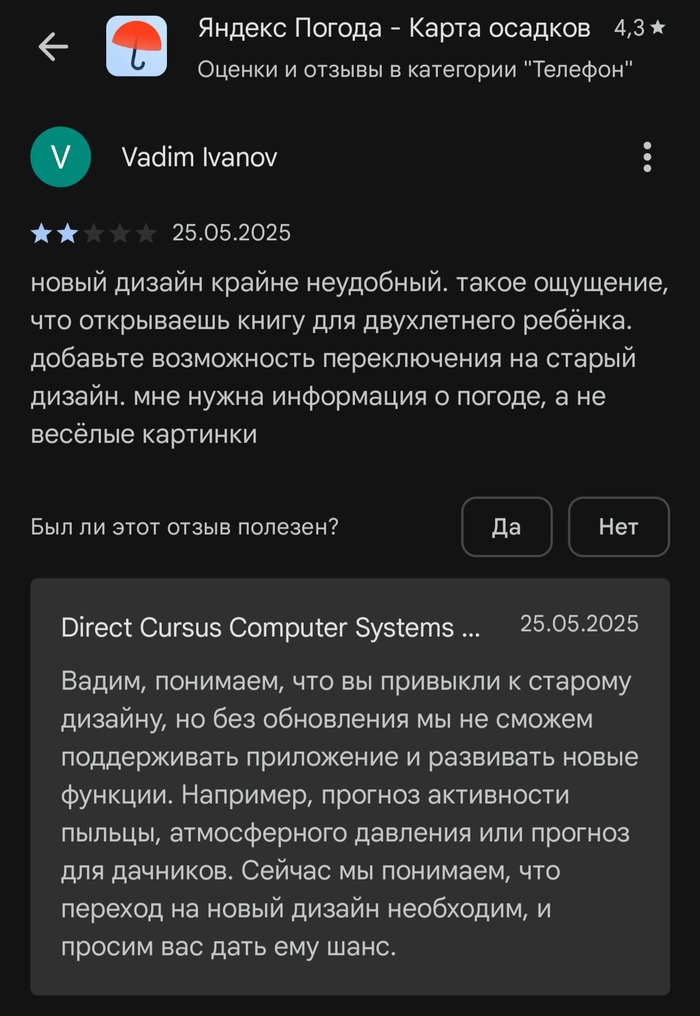 Давно пользовался Яндекс Погодой на мобиле, всё устраивало. Недавно, зайдя в приложение, прихуел от нового дизайна, который включили принудительно. Возможность вернуться к старому дизайну убрали.