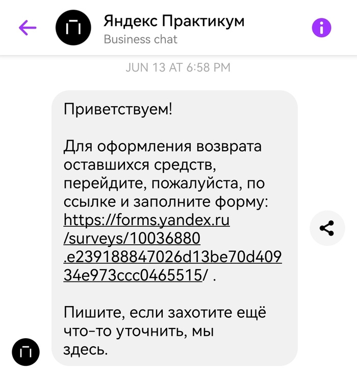 Замечаю, что на сайте запросить возврат невозможно. Нахожу официальную страницу Яндекс Практикум в Facebook и пишу им в личку.
