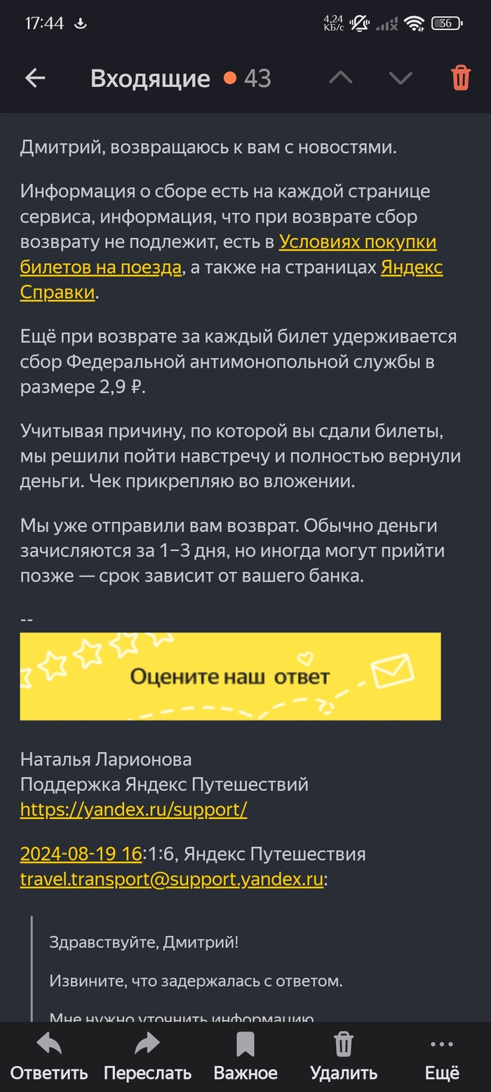 Каково же было мое удивление, когда на карту мне упала не вся оплаченная сумма, а ее часть - 13 451.40₽. При условии, что билеты я верну за полтора месяца! Не на что особо не надеясь, я написал по обратной связи письмо с описанием проблемы и вопросом: "за что!?".