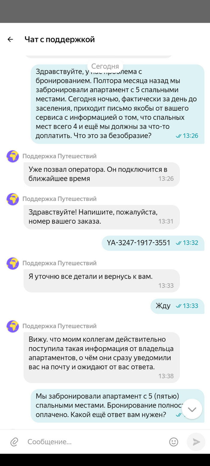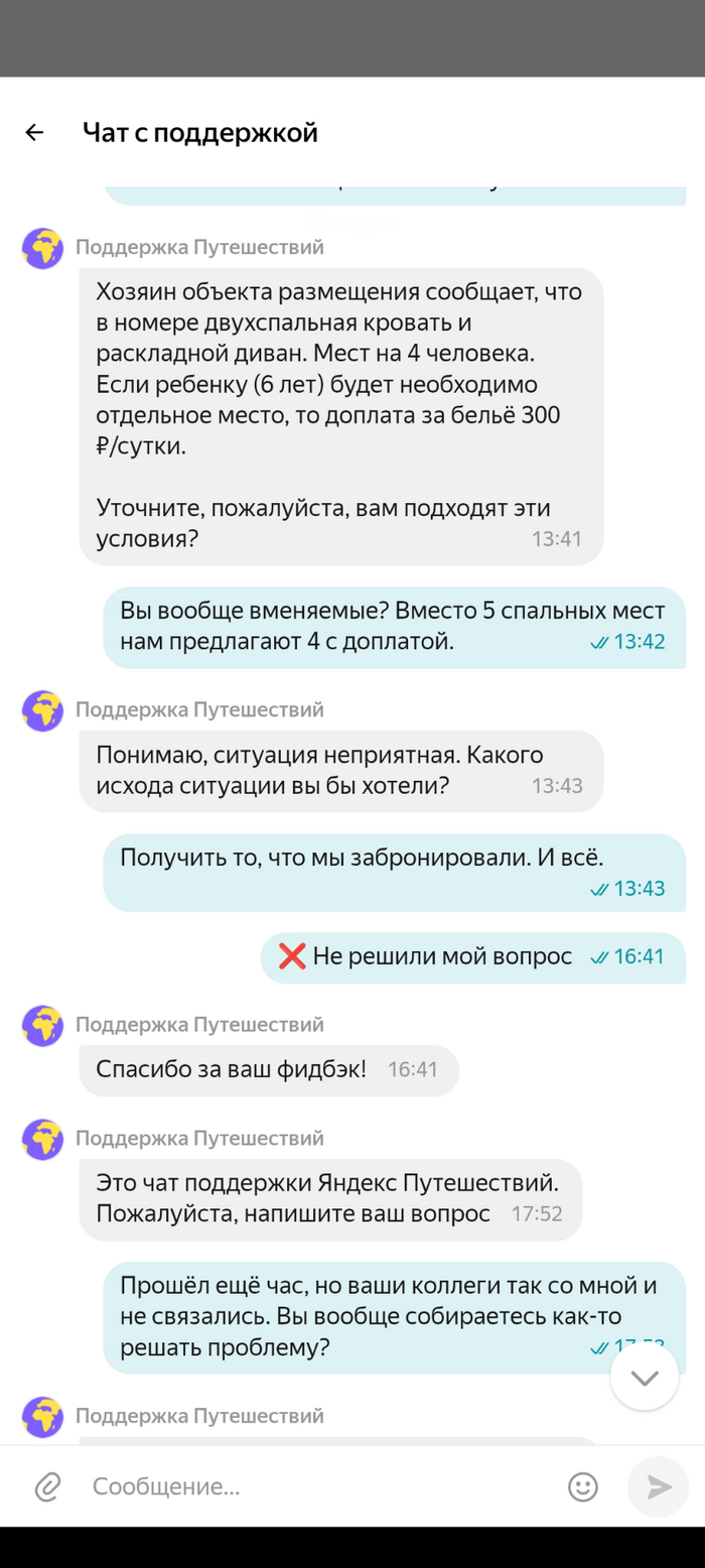 Ммм, неожиданно. У нас бронирование на 5 спальных мест, так как семья у нас многодетная - мама, папа плюс трое детей. Отменить бронирование уже нельзя. Времени, чтобы заново забронировать подходящее жилье, уже физически нет. Новогодние каникулы - всё уже давным-давно забронировано и перебронировано. Пишу в чат поддержки Яндекс Путешествий в надежде побыстрее решить этот вопрос. Но не тут-то было. Забегая вперед скажу, что ничего решить не удалось. А вот наш многочасовой диалог: