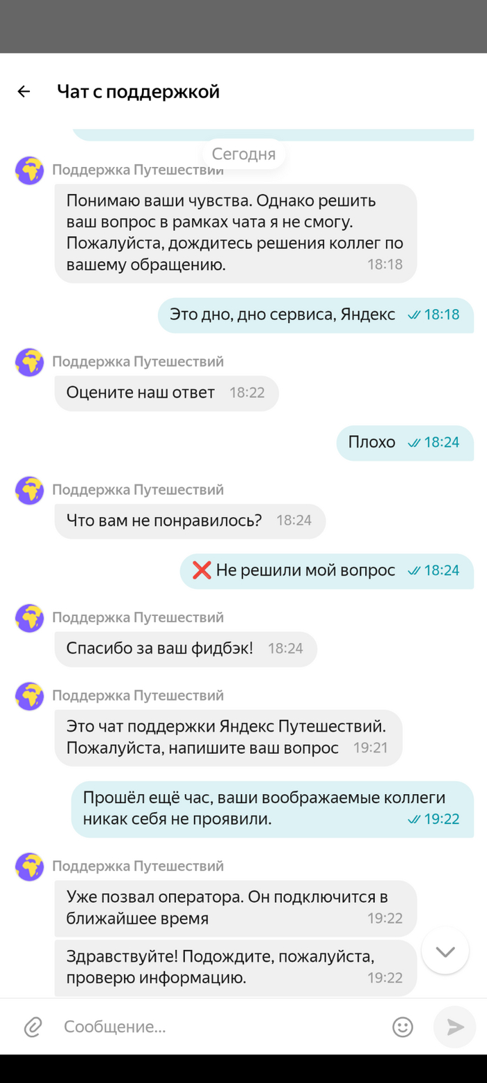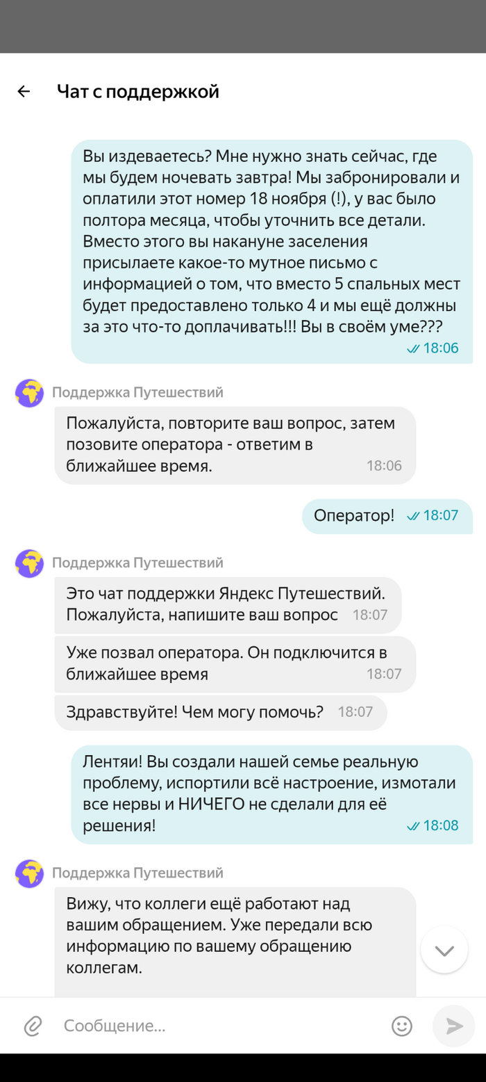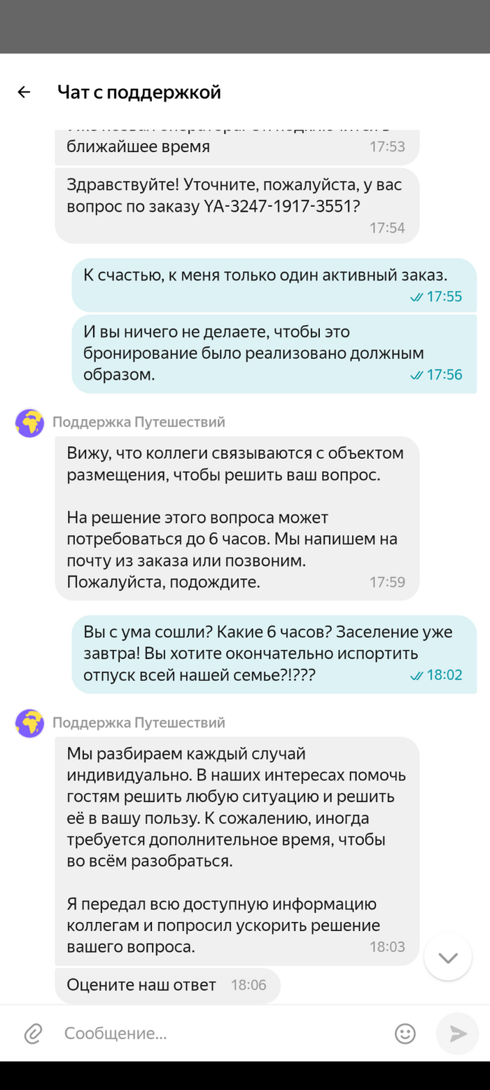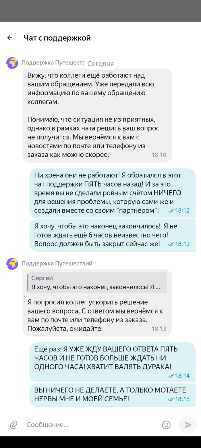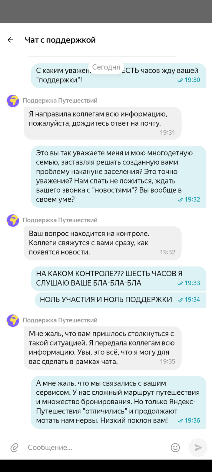 Диалог в таком же ключе продолжился ещё несколько часов, но ничего кроме "ждите, мы обязательно вам позвоним" я не добился. Итого: никто со мной так и не связался, сейчас час до полуночи и, соответственно, до даты оплаченого бронирования. ХЗ куда мы завтра поедем и где переночуем. @yandex.travel, сердечное вам "спасибо" за потраченные нервы и испорченный отпуск от всей нашей многодетной семьи! Век не забудем! Больше никаких бронирований с вашим сервисом!