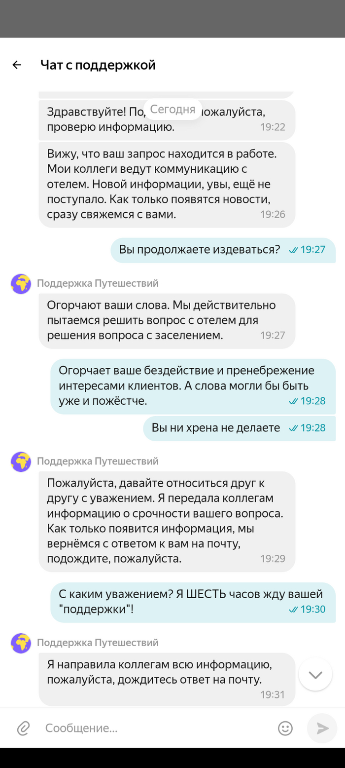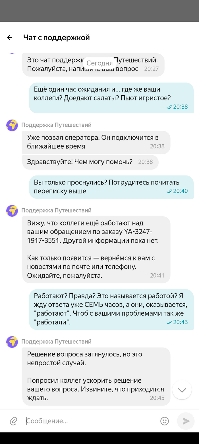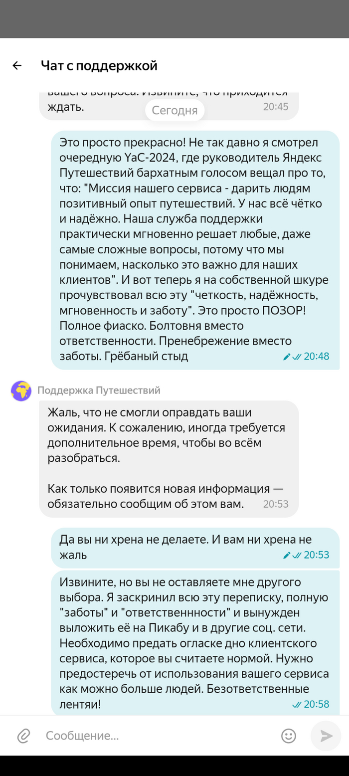 UPD2: Прежде чем начать "истерить" здесь я перепробовал все способы коммуникации с Яндекс Путешествиями: электронка, чат, ВК, Телега. В ответ - игнор. Поэтому я и решил сделать максимально эмоциональный или, если хотите, ИСТЕРИЧНЫЙ пост для привлечения внимания. И это сработало) Будет совсем круто, если эта история заставит Яндекс пересмотреть свои стандарты качества поддержки своих клиентов.
