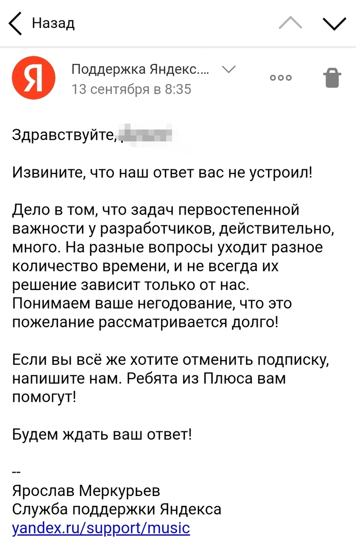 Решил написать пост, т.к. накипело. Пользуюсь подпиской от Яндекса, частенько слушаю Яндекс музыку и радио этого же сервиса. По началу всё было неплохо, но потом стали появляться демо, лайв, перепевы и другие версии далёкие от оригинала, те же версии часто выдаются в результате распознавания музыки. Решил написать в поддержку через приложение Яндекс музыки, на что получил письмо, с вот таким содержимым: