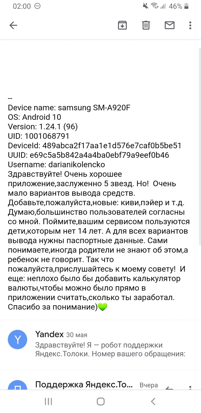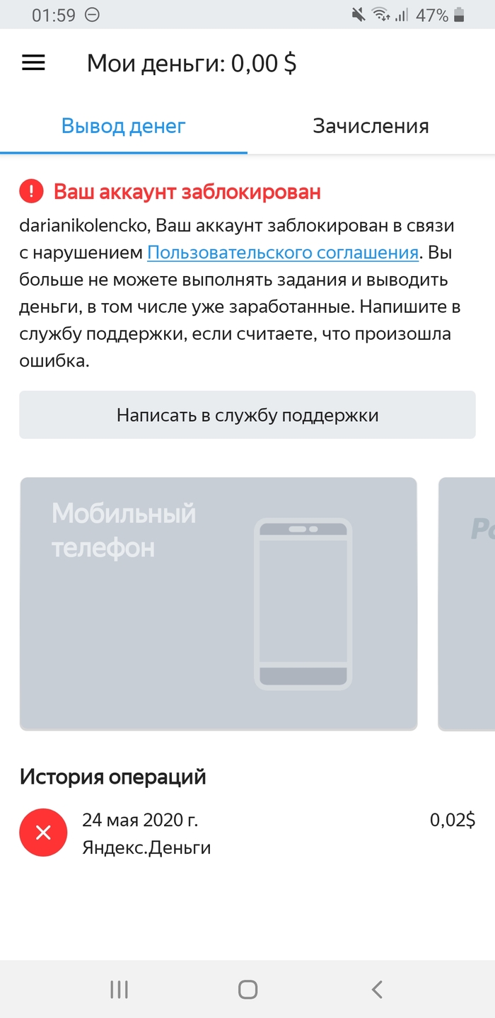 Просто крик души и сознания. И так...Многие из вас знают сервис "Яндекс Толока",верно? Так вот. Я решила подзаработать денег,чтобы накопить на мечту. Ну,захожу,выполняю задания (набрала мало денег,но все же). Прошла неделя. Я решила написать отзыв о том,какое приложение хорошее. Написала так же им на почту предложения по улучшению сервиса(может прекреплю фото) и... Меня забанили! Ответ на свое предложение получила: "Сервисом могут пользоваться только лица,достигшие 18 лет". Я подумала: ну и что? У вас задания лёгкие,есть кнопка,скрывающая контент 18+,что еще?! Но все не так просто как кажется... Они заблокировали мой аккаунт... просто.. ОТОБРАВ ДЕНЬГИ! Конечно,там же всего 0,04 цента... Но! Это забота о клиентах?! Человек собственным трудом это заработал,а они отбирают?! ДА,Я ШКОЛЬНИЦА,НО ЯНДЕКС ТОЛОКА СОЗДАН ДЛЯ ЗАРАБОТКА! КАКАЯ ИМ РАЗНИЦА КТО ВЫВОДИТ ДЕНЬГИ?! Простите за 2 строки капслока. Это бесит. Я считаю, что Яндекс Толока просто дурачит клиентов...