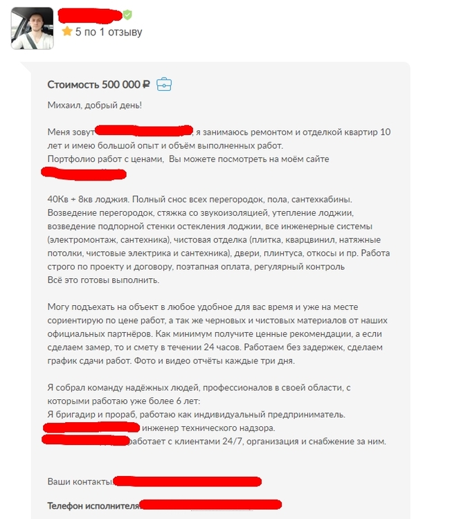 Ну собственно я и решил что хочу сотрудничать с существующей фирмой работающей не первый день и по которой можно посмотреть судебную практику. Для этого я и запросил огрн, инн, название вашего ООО. Я оценивал, методом пол-палец-потолок общую сумму с материалами примерно в 1 млн рублей. Опубликовал на сервисе YouDo заявку на ремонт, с ценой контракта от 500к рублей (самая дорогая категория, дороже нет):