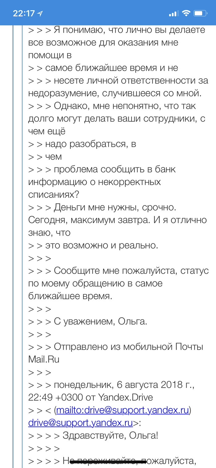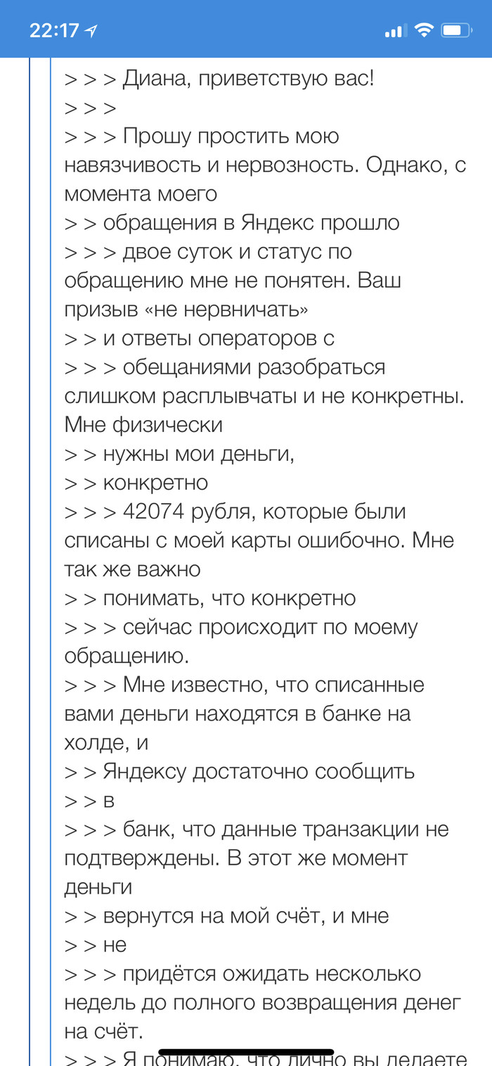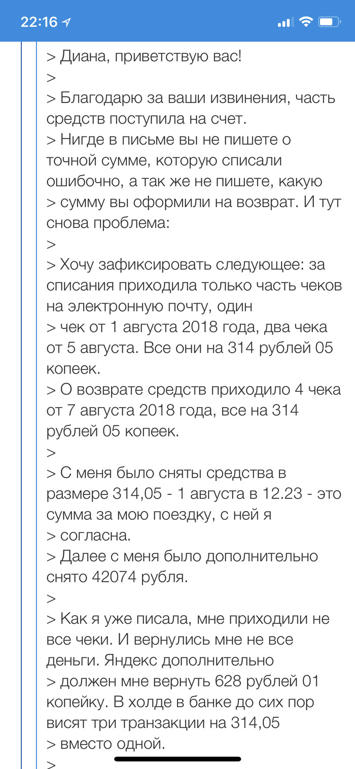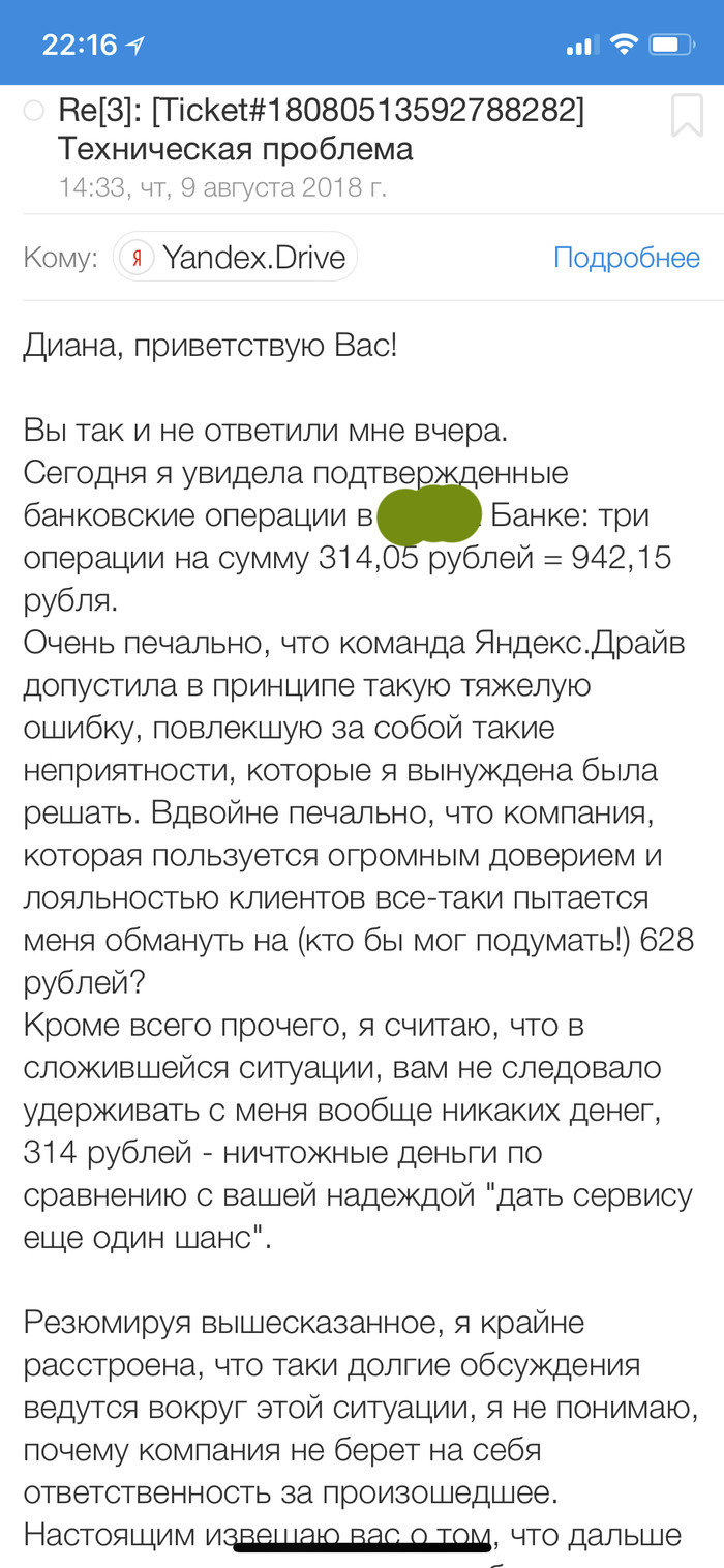 Честно, я думаю, было бы правильно со стороны Яндекса аннулировать поездку в принципе и вернуть мне все деньги. Видимо, сотрудники Яндекса другого мнения.