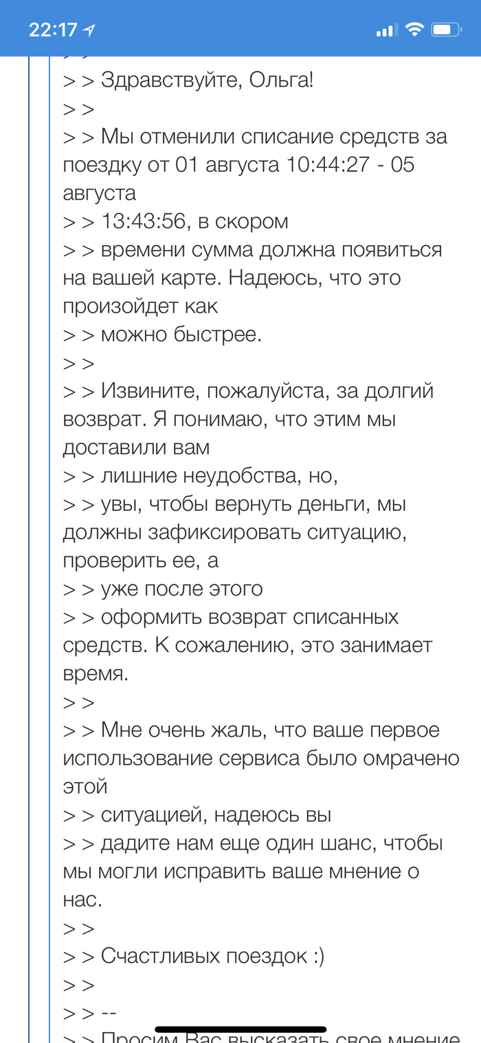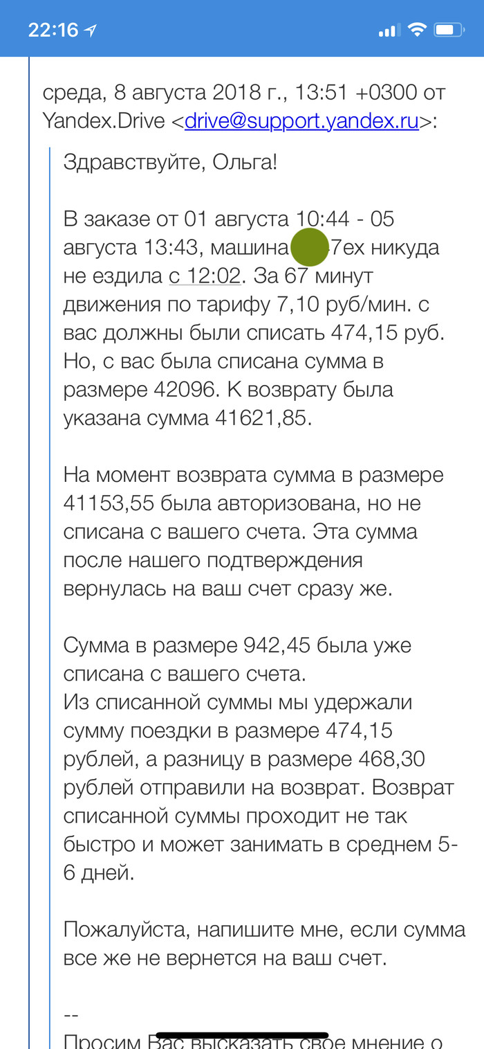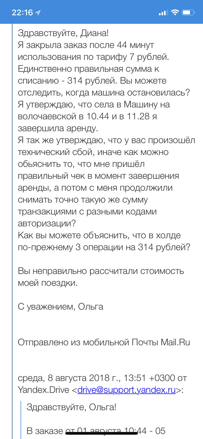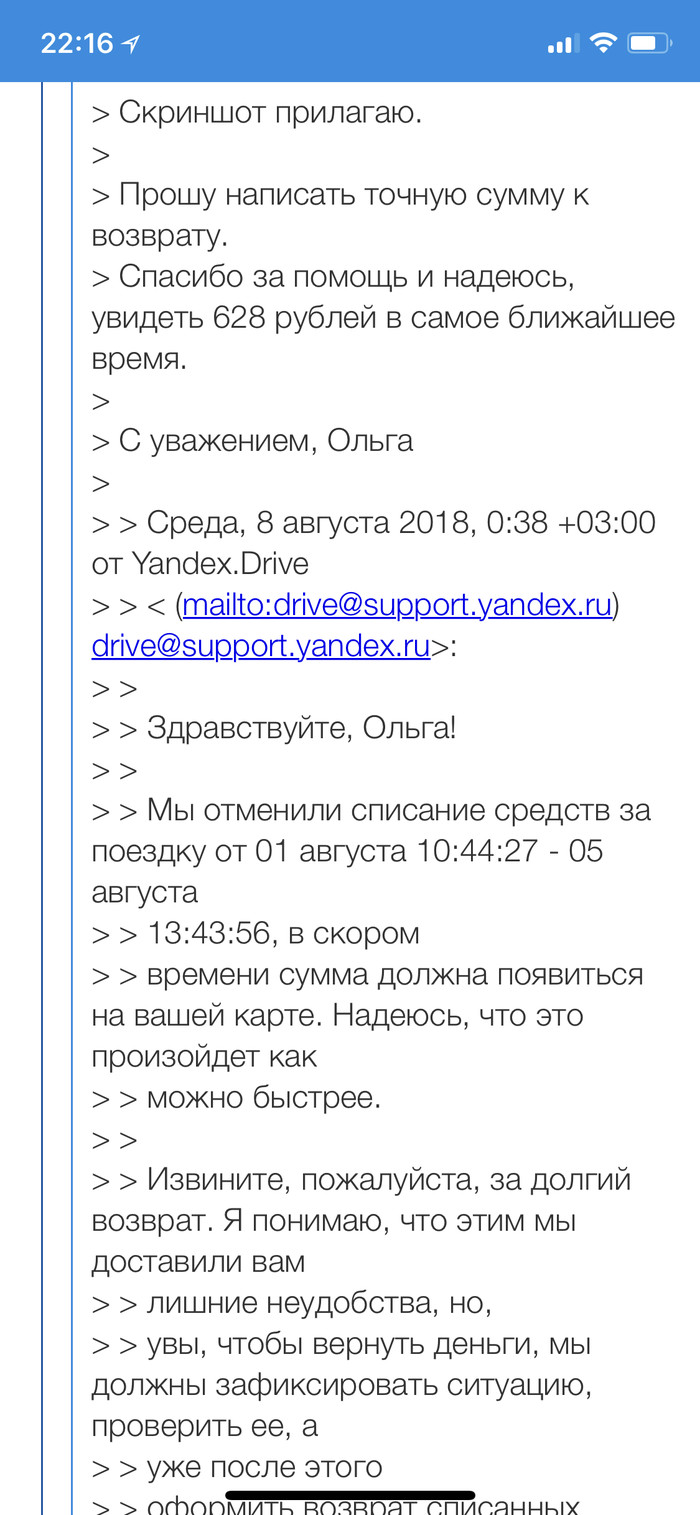 Честно, я думаю, было бы правильно со стороны Яндекса аннулировать поездку в принципе и вернуть мне все деньги. Видимо, сотрудники Яндекса другого мнения.