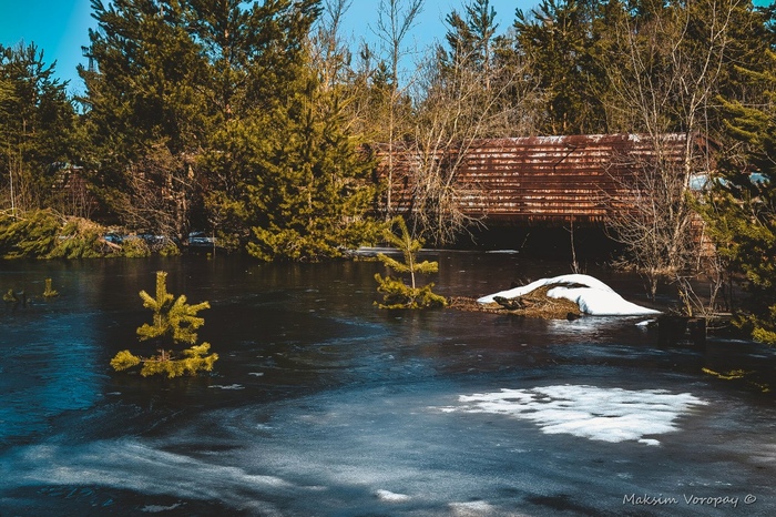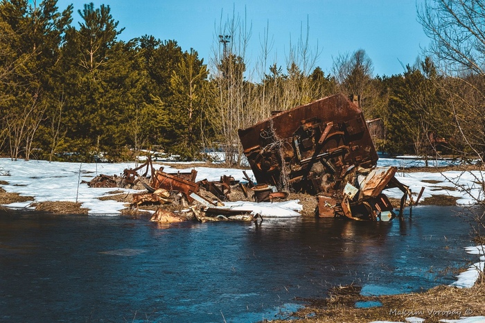 Апрель тогда выдался прям замечательный. Снега за зиму навалило тьма. Теперь эта масса собиралась растаять и уже кое где во всю исполняла желаемое. Воды в некоторых местах набралось много, превратив низины в подобие озер с торчащими то тут то там деревьями, а кое-где и домами. ( дома , конечно, в заброшенных селах). Но к площадке хранения подойти всё же удалось, она расположена на возвышенности.