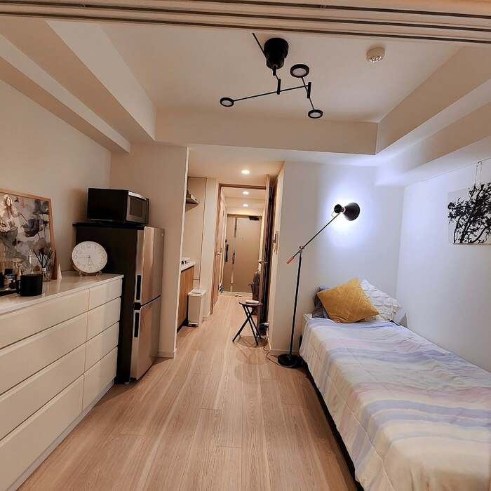 1R (one room) - это квартира без перегородки между гостиной и кухней. Во многих случаях кухонное оборудование компактное, а туалет и ванная комната объединены, но это позволяет увеличить жилую площадь и эффективно использовать пространство. Даже при одинаковых условиях аренда дешевле, чем в квартирах типа 1K или 1DK, поэтому такой вариант рекомендуется для одиноких людей, желающих снизить расходы на жилье.
