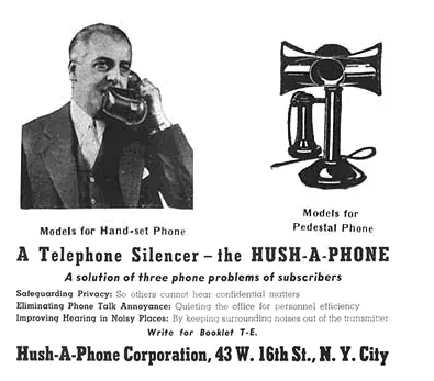 Hush-A-Phone, он же тише-фон — устройство для шумоподавления, которое крепилось на микрофон. Появился тише-фон в 1921 год и выглядел так:
