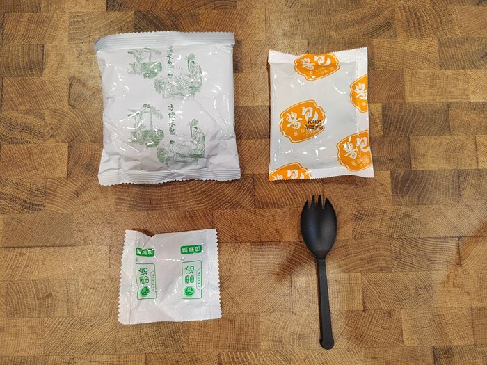В комплекте сама лапша, суповая основа, пакетик с овощами и красная вилка.