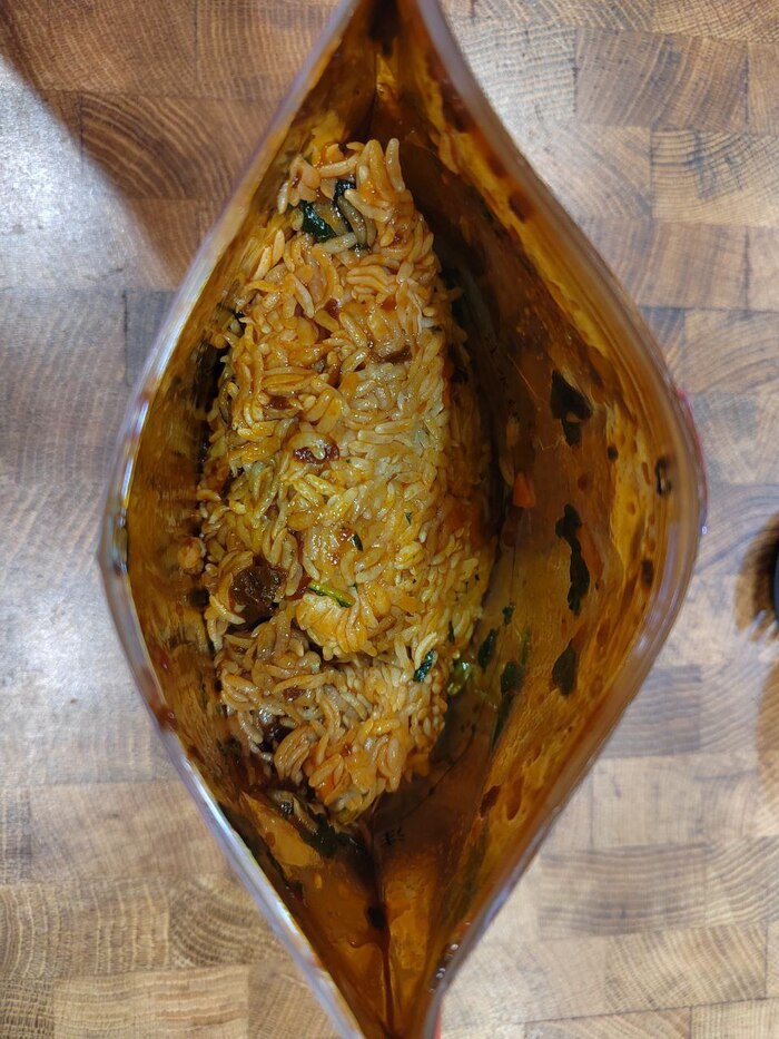 Залив кипятком рис и овощи, выждав нужное время я добавил заправку, тщательно перемешал и получил то, что на фото. Даже хорошо побултыхав рис в пакете, перемешалось не очень (как видно на фото), но это скорее я неправильно добавил приправу. По вкусу - вкусно, но вот текстура так себе, прям каша. За цену 112 рублей неплохо, но даже несмотря на то, что это "экзотика", все равно дороговато.