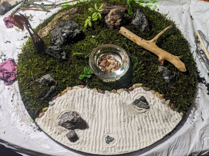 Тут уже инвестировала в песок для шиншилл. Очень мягкий и чистый песок, кстати. Для понимания размера: в центре подсвечник, с лёгкой руки вашего покорного слуги превращённый в озерцо