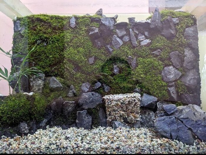 А вот тут уже потратилась изрядно. Где-то долларов 50, хотя аквариум на 60л достался бесплатно. Камни и мох традиционно выловлены в диких условиях обитания