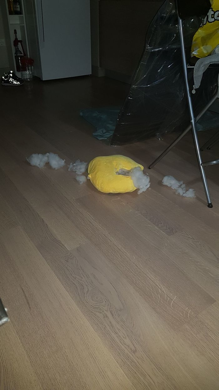 Фото уставшего собакена после прогулки и остатки подушки прилагаются.