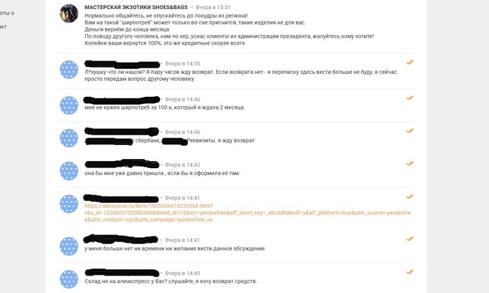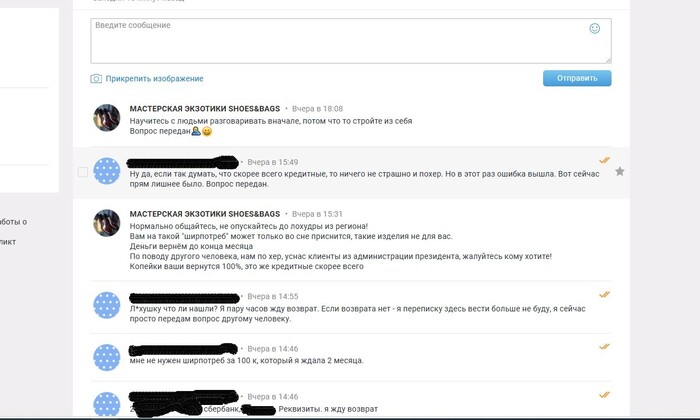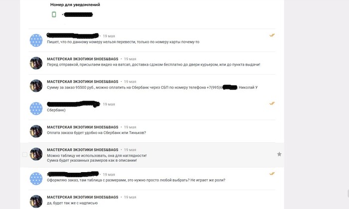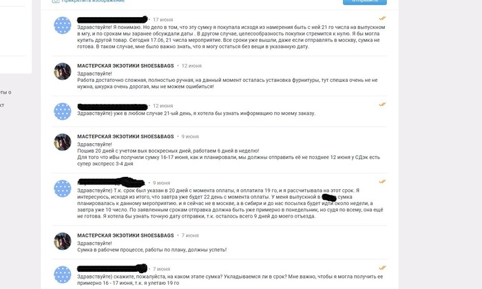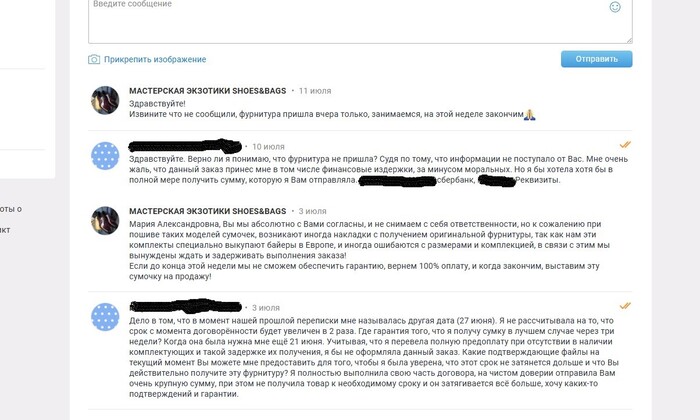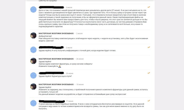 Я так понимаю, он её с алика ждал и фото скорее всего тоже оттуда. Николай Николаевич У, шьющий сумки администрации Президента, а не "региональным лохудрам" с кредитными копейками, и ждущий загадочную фурнитуру полтора месяца, кормящий завтраками, и умеющий нормально разговаривать. Потом уже мы накопали отзывов, что под разными предлогами он сливается от посещения мастерской, которую ещё никто не видел, присылает вещи ненадлежащего качества и не подходящие по размерам. Но мы ориентировались на отзывы площадки, они 99% хорошие.
