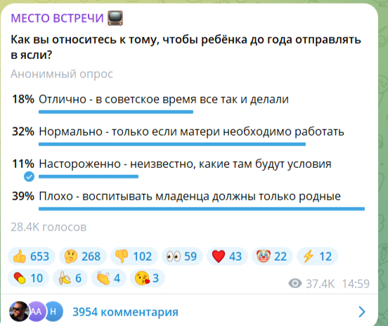 Вчера в программе "Место встречи" на НТВ обсуждался вопрос, в анонсе программы сформулированный следующим образом: "Ребенка - в ясли, мама - на работу: в России призвали возродить ясельные группы, чтобы женщины могли не ставить крест на карьере. Откуда звучат голоса ПРОТИВ этой инициативы?"