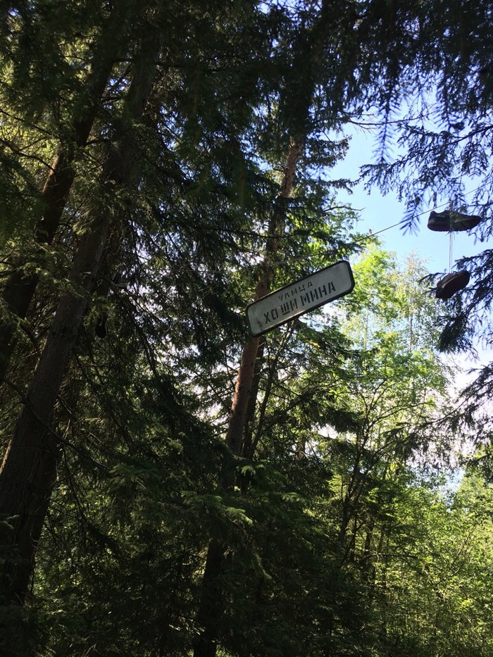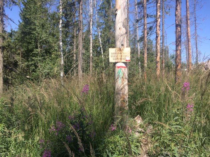 Переходим по мосткам из бревен болотинку и видим и видим вывеску, значит вы на верном пути: