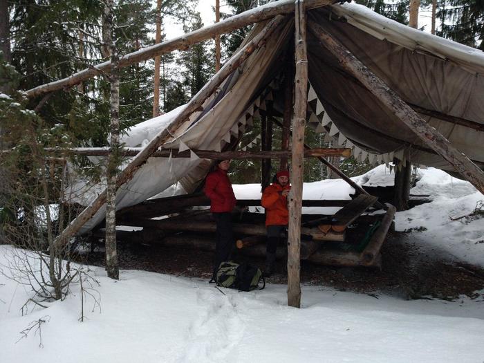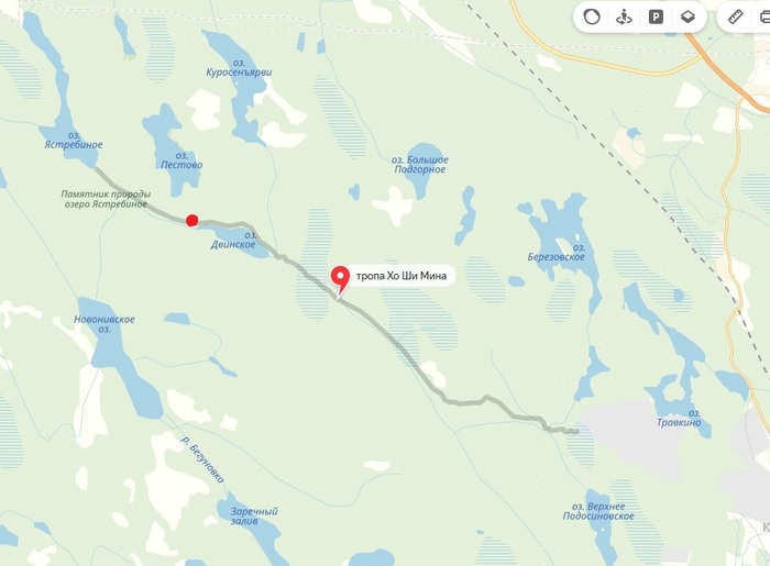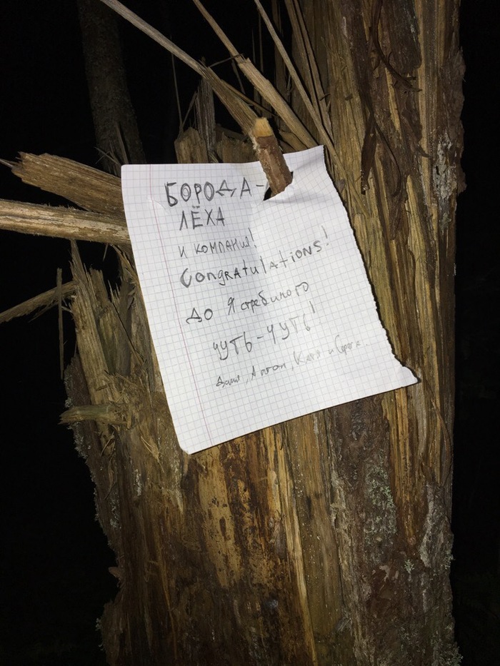 В один прекрасный момент доходим до озера Двинское. Там есть указатель "стоянки", в виде деревянной таблички налево. Нам направо, так же по меткам на деревьях и движемся, озеро должно остаться по левую руку, озеро Пестово по правую руку. В конце озера остановились на последний привал и оставили записку друзьям, которые должны были идти к нам уже по темноте, она их порадовала после изнурительной ходьбы. От этого места до Ястребиного идти остается 20-25 минут. Примерно вот от этой красной точки.