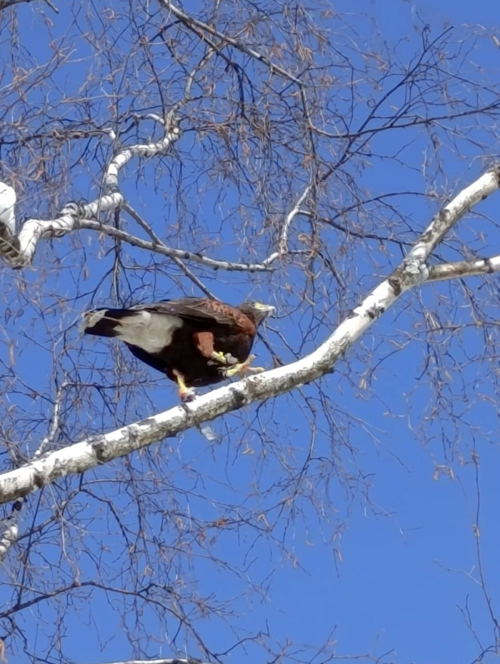 Место действия Харовский округ Вологодской области. Пишут что это ястреб Харриса. Судя по манжету на лапе у птицы есть хозяин.