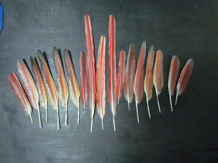 Вот это перья красного ары - крупного и красивого попугая. Посмотрите, какой красивый у них отлив! Они очень необычные - сверху синие, а снизу бордовые. Пожалуй, это самые красивые перья из всех, что у меня есть) представляю, насколько шикарный ловец можно с ними сделать)