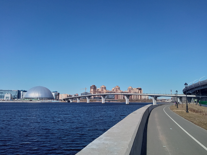 Сам же я только на этой неделе сумел выбраться на мост, дождавшись просто замечательной питерской погоды. Добравшись на Крестовский остров посредством зеленой ветки метро и выйдя на станции Зенит, начал прогулку на север по западной набережной, любуясь видами и наслаждаясь тёплым солнцем.