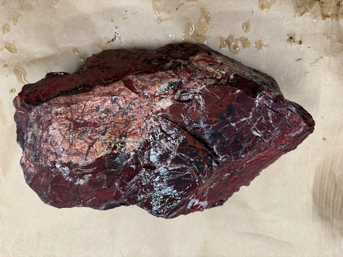 Почему же яшма с этого месторождения обладает таким уникальным цветом? Главную роль здесь играет железо и марганце. Наличие минералы в различных соединениях в составе яшмы и придаёт ей такие глубокие темно-красные и фиолетовые оттенки. Белые жилы, в свою очередь, представляют собой включения кварца, который подчеркивает красоту основного цвета.