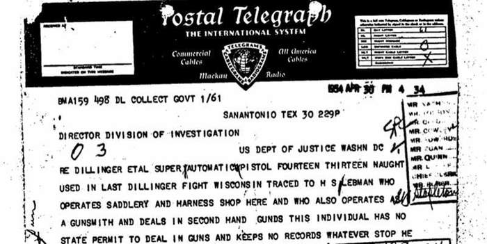 Телеграмма полиции Сан-Антонио: «пистолет Диллинджера с номером 14130, использованный в последней перестрелке в Висконсине. Прослежен до некого С. Лебмана, который управляет магазином упряжи, а также торгует б/у оружием без государственной лицензии