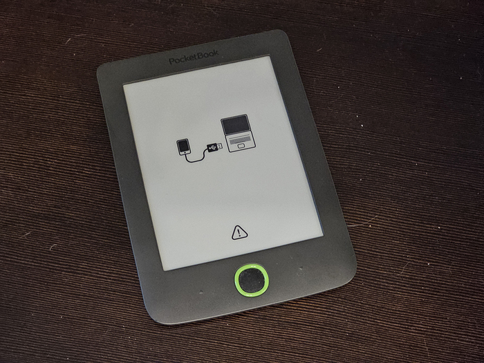 Осенью-2025 моя электрическая книжица Pocketbook 515 mini приказала долго жить. Вот она, зависла в таком состоянии и ни на что не реагирует: