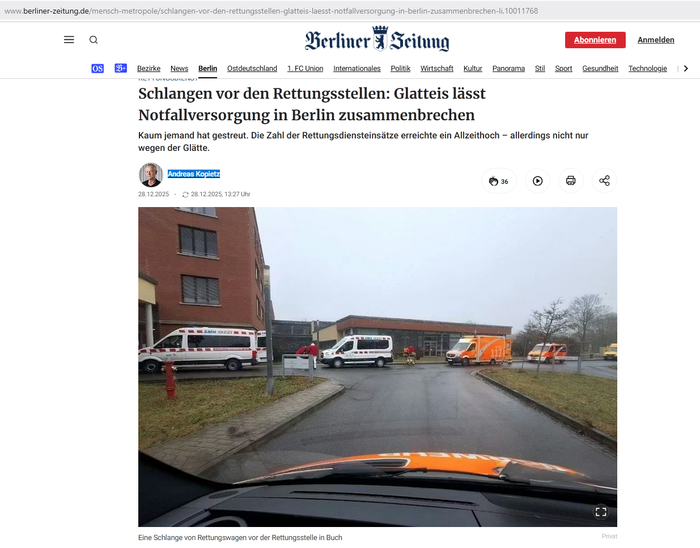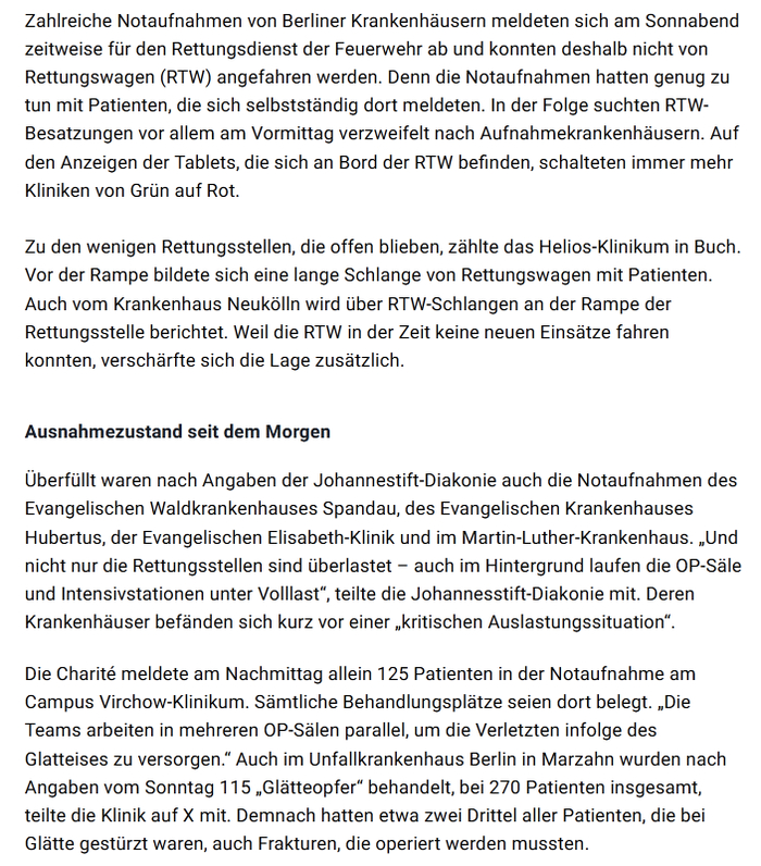 Поскольку кабинеты врачей были закрыты из-за рождественских праздников, пациенты еще чаще, чем обычно, обращались напрямую в берлинские отделения неотложной помощи или звонили по номеру экстренной службы 112. Гололед еще больше усугубил напряженную ситуацию в берлинской службе спасения и в сфере неотложной медицинской помощи.
