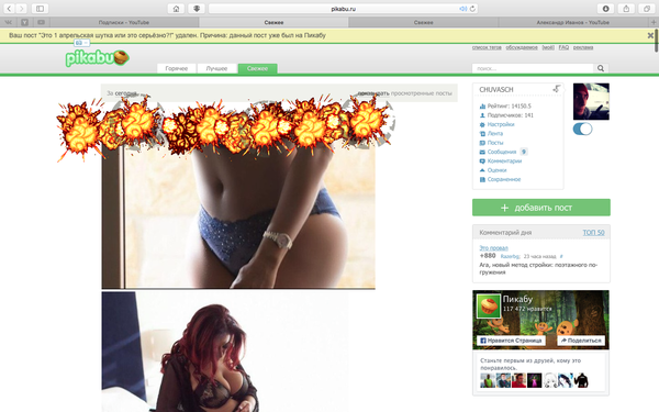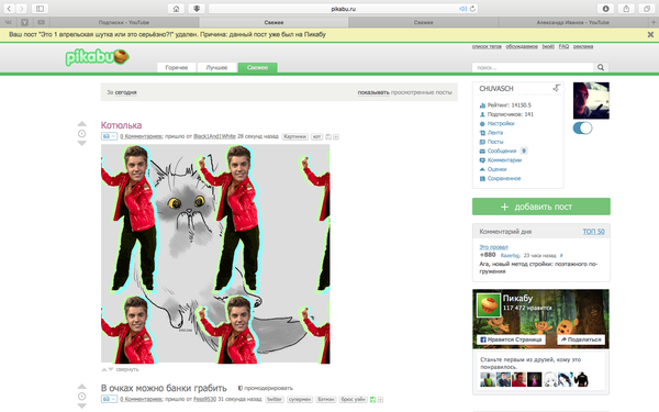 vozrojdenie Биберназ 9 лет назад Кто не знает - в честь праздника пользователям была дана возможность "модерировать". Решил испробовать возможности "модерирования" на первом попавшемся посте.И тебя с первым апреля, любимый Пикабу ;) Джастин Бибер 1 апреля