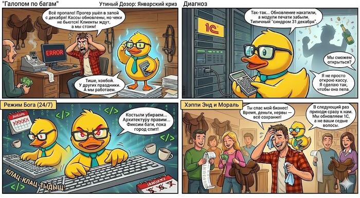24.12.25 - середина предновогодней недели, самый долгожданный чёс для бизнеса. Утром прилетает обновление 1С УНФ, через которую у нас в магазинах ходят эквайринги, кредиты и бьются чеки. Всё это моментально отваливается, остаётся только возможность бить чек за наличку. Т.е. 99% клиентов идут лесом. Бонусом ко всему этому великолепию - обновлённый, совершенно перегруженный интерфейс кассира. Если раньше было две кнопки, то сейчас пробить чек - целый квест.