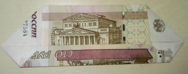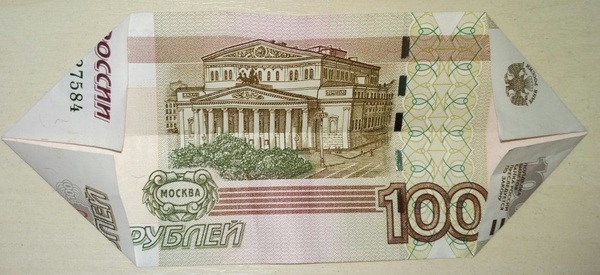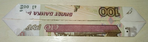 В Оригами присутствует такой интересный раздел, как MoneyGami, т.е., буквально, "денежное оригами". Суть заключается в складывании фигурок из банкнот без участия клея и ножниц (дабы затем можно было бы использовать купюру по прямому предназначению. Хочу представить поэтапное складывание известной модели галстука-бабочки из сторублевой купюры, в комментариях же оставлю фотографии различных моделей из купюр. Итак, поехали!