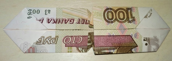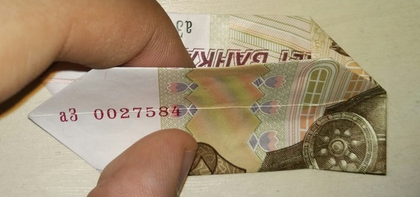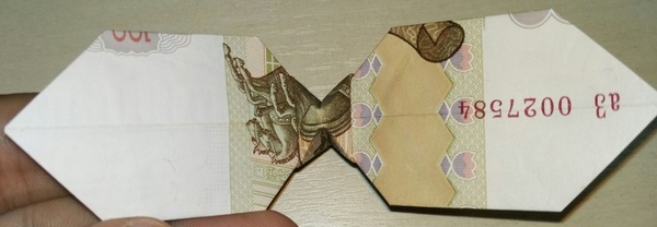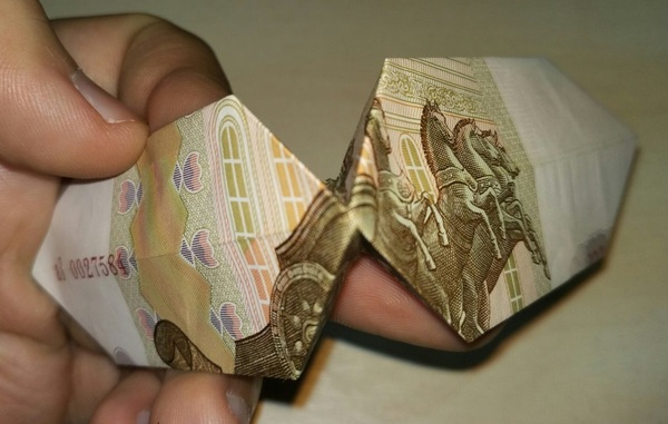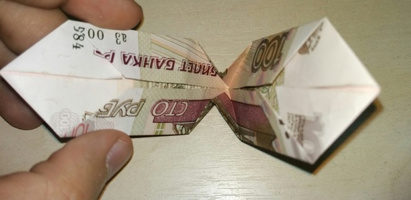 12. В итоге получается элегантная "бабочка", которую можно положить в заначку и, при необходимости, использовать, разобрав, по назначению. Для заначки рекомендуется использовать купюру номиналом от 1000 рублей :)