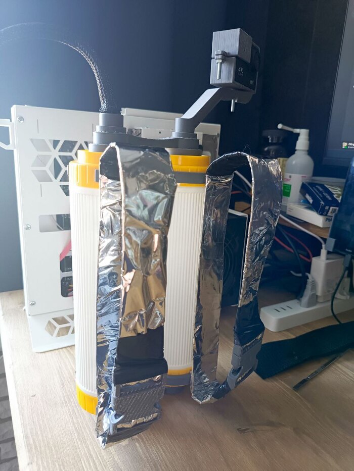 Мы с дочерью делаем костюм космонавта. Уже сделали самую сложную нудную часть - систему жизнеобеспечения. Два пустых фильтра для воды, 2 часа моделинга и день печати: