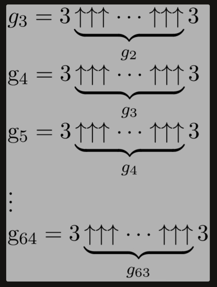 Производить даже приблизительные расчеты тут бесполезно и невозможно. Наш ум не способен воспринять число степеней. Это число не описать. Его нельзя сравнить ни с чем, потому что оно превышает все известные нам величины. С тремя стрелочками мы хотя бы могли вообразить расстояние «башни». А здесь даже ее высоту не с чем сравнить. Причем даже если мы заполним всю обозримую Вселенную этими «башнями», мы и близко не получим это число. Потому что количество этих «башень» будет лишь указывать на то, сколько «башень» еще нужно построить, чтобы получить число следующих «башень» и так множество раз.