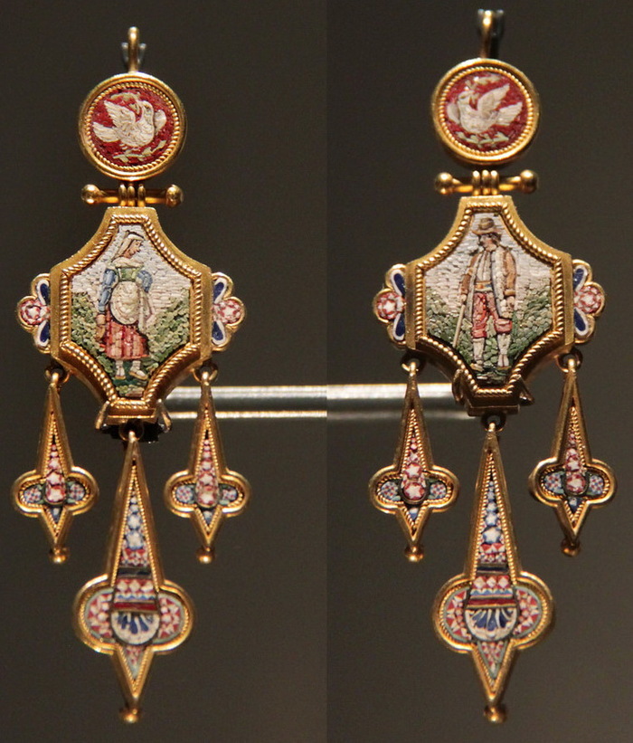 Серьги эпохи рококо с использованием золотых креплений и расписного фарфора в качестве основного декоративного элемента.