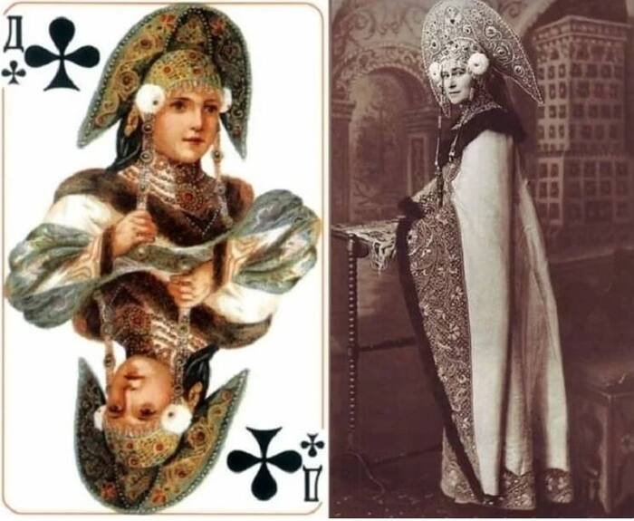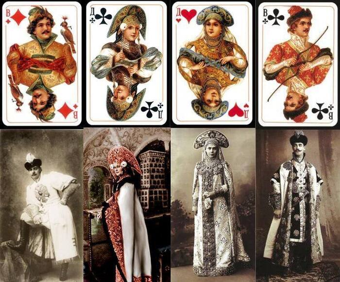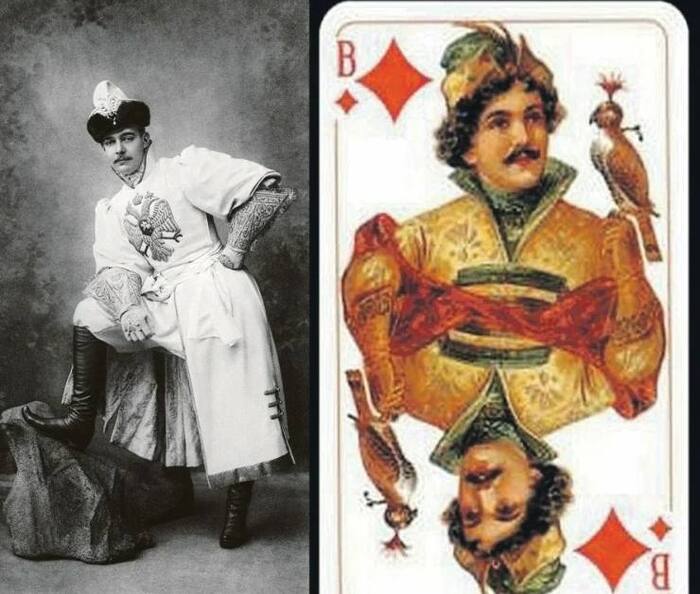 В 1911 году в Германии, на фабрике карточных игр Dondorf во Франкфурте‑на‑Майне, художники получили задачу придумать «русскую» колоду. Они просто открыли фотоальбом с балом 1903 года и честно пересрисовали костюмы участников: короли, дамы и валеты «Русского стиля» — это реальные придворные, зафиксированные в тех самых маскарадных нарядах. Исключение сделали только для короля пик: его одели по мотивам образа Ивана Грозного, а не конкретного гостя бала.