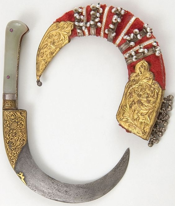 1. Индийский (Махараштра) кинжал "тигриный коготь", XIX век, сталь, бронза, золото, нефрит, жемчуг, дерево, бархат, общая длина 21 см.