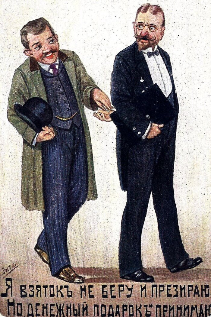 К порученному делу вообще относятся добросовестно и стараются исполнить его по мере сил и способностей; огромное большинство ведет себя добропорядочно и честно, но бывают и взяточники, особенно в специальных ведомствах. В этом отношении весьма печальною известностью пользуются интенданты, инженеры путей сообщения, экономы и смотрители казенных учреждений. Эти господа действительно не пропускают того, что плывет мимо. Достаточно указать на ряд интендантских процессов после турецкой войны 1877 г. и на обнаруженные в августе 1892 г. злоупотребления инженеров путей сообщения в Могилевском округе, где кучки шоссейного щебня оказались из мусора и где прикарманивали строительные суммы с крайней наглостью и бесцеремонностью, так что Министерство путей сообщения сочло нужным преподать своим служащим уроки о подрядах и поставках и о ведении отчетности». Зарплаты чиновников были относительно небольшими. В начале 19 века городничий официально получал 300 рублей в год, а это фактически глава уездного города. Тема вороватых чиновников и низких зарплат не раз встречается в литературе. Чичиков получал 400 рублей в год плюс премии, а за новую приличную шинель он заплатил 80. Мелкий чиновник Мармеладов в «Преступлении и наказании» на службе получал примерно 30 рублей – не так уж много, но семья была и этому рада. Часть чиновников имела иные доходы, особенно дворяне до отмены крепостного права. Часть компенсировала маленькую зарплату взятками и поборами. Во второй половине 19 века зарплаты в целом выросли.