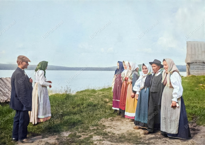 Молодежь танцует кадриль на берегу озера. Этнографическая экспедиция в Беломорскую Карелию, 1915 год.