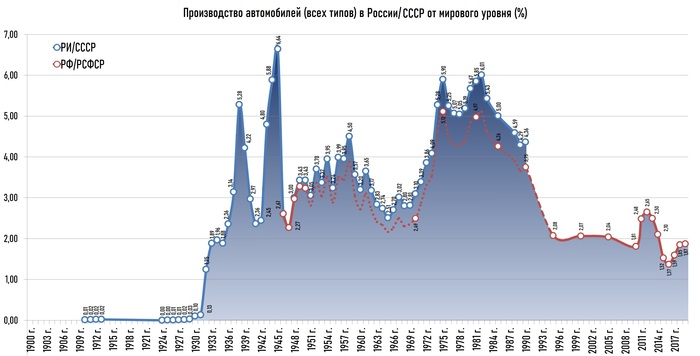 И на закуску суперинтересная инфографика. Случайно нашёл. Какой % от мирового производства автомобилей был в РИ, СССР, России.