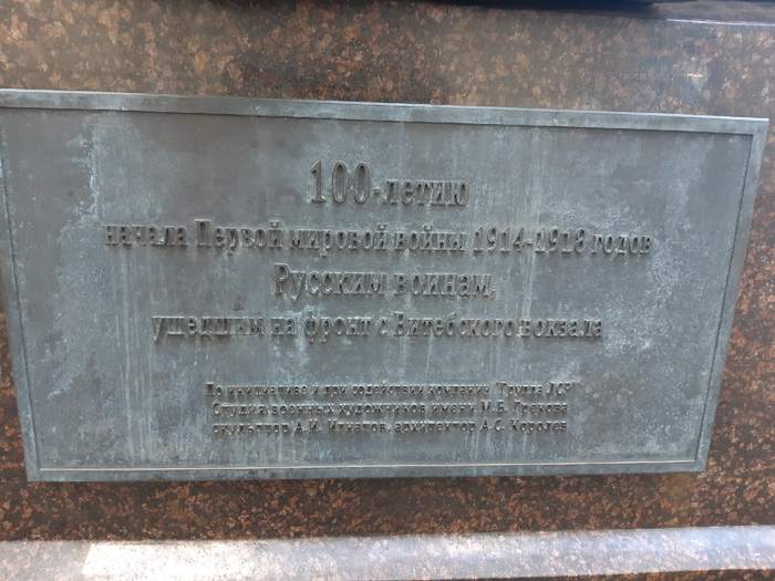 Памятник 100-летию начала Первой мировой войны 1914-1918 годов. Русским воинам, ушедшим на фронт с Витебского вокзала