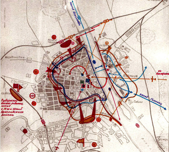 Карта-схема действий советских войск и повстанцев по состоянию на 17-18 июля 1918 года. Коричневым цветом на карте города закрашены сгоревшие кварталы.