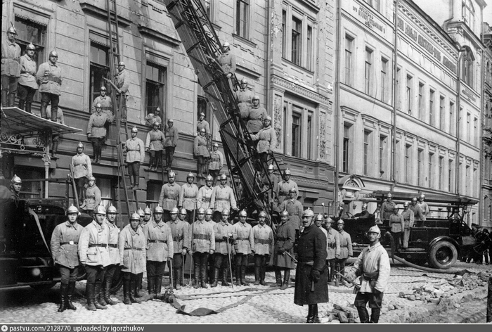 Практические занятия с механической лестницей на здании управления пожарной охраны на Набережной реки Мойки.