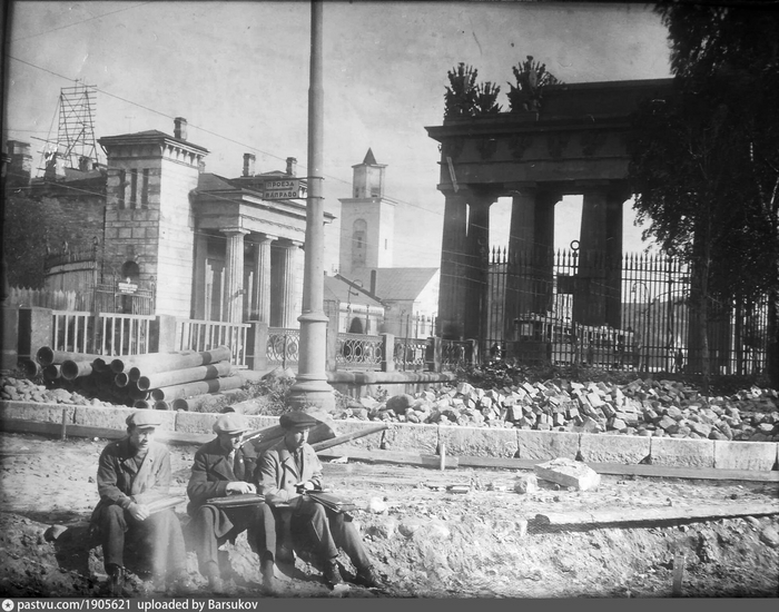 Идёт капитальная реконструкция площади Московские ворота. Уже через год сами Московские ворота с площади снесут, а вернутся они обратно лишь в 1959 году.