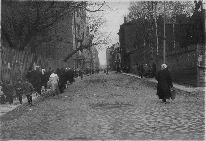 А теперь давайте перенесёмся на Лиговский проспект (который тогда, кстати, был улицей) и посмотрим, что там творится. Снимок сделан неподалёку от Кузнечного переулка.