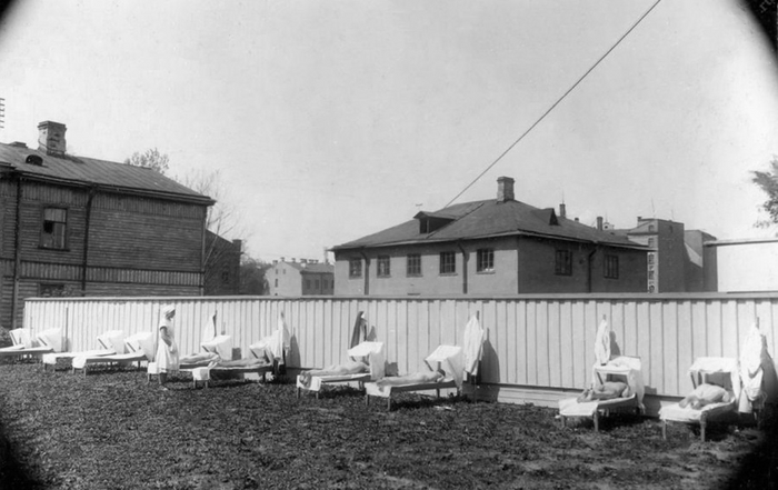 Больные принимают солнечные ванны во дворе лечебно-профилактического комбината имени Ленина (современная Покровская больница на Васильевском острове).